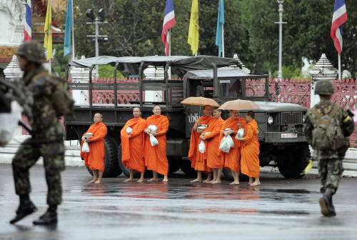 중무장한 군인들이 분주하게 발걸음을 옮기고 있고 군용 트럭도 보입니다. 트럭 앞에는 승려들이 줄지어 서 있습니다. 사진이 작아서 명확하진 않지만 승려들은 밝은 얼굴로 이야기를 나누고 있습니다.