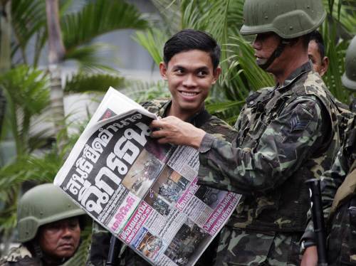 태국 군인들이 조간 신문에 실린 쿠데타 관련 기사를 읽으면서 크게 웃고 있습니다. 쿠데타는 성공했다는 기사겠지요.