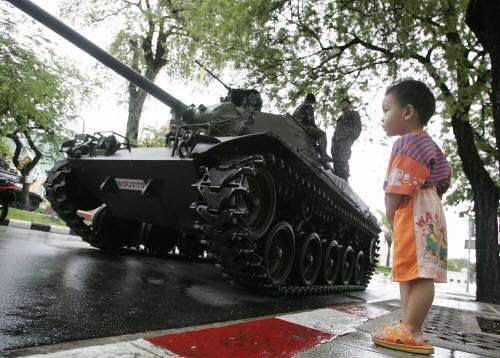 한 남자아이가 방콕 시내 정부청사 인근에 서 있는 탱크를 바라보고 있네요.