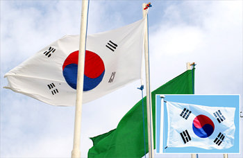 19일 한명숙 국무총리가 리비아를 방문했을 때 미티가 공항에 걸린 태극기. 이 태극기는 리비아 측이 만든 것으로 국기의 가로 비율이 길고, 태극의 크기도 지나치게 크며, 태극의 테두리와 괘의 직선은 자도 대지 않고 그린 듯 삐뚤삐뚤하다. 한 총리는 이 태극기 아래서 의장대를 사열했다. 총리실 관계자는 “주리비아 한국 대사관에서 규격에 맞는 태극기를 제공했지만 리비아 측이 자기 나라 국기보다 커서 걸 수 없다며 직접 만들어 걸었다”고 말했다. 국내에 다양한 크기의 태극기가 제작되고 있는 점을 감안하면 주리비아 대사관의 대응은 안이했다는 지적이 나온다. 작은 사진은 올바른 태극기.