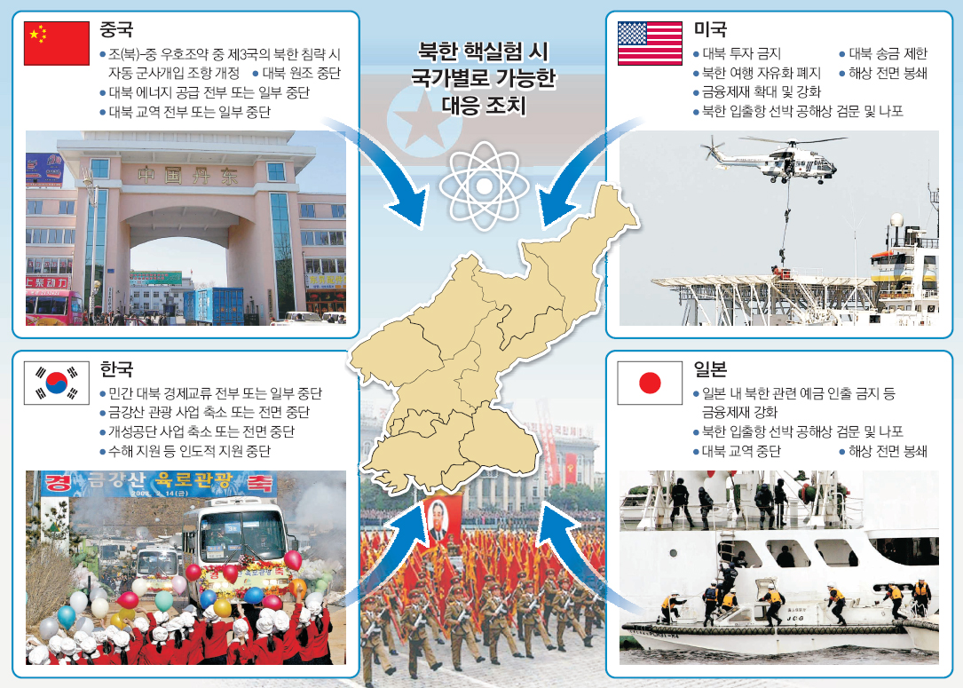 ▽한국은 금강산 관광 및 개성공단 사업 중단 검토=정부는 북한이 핵실험을 하기 전 먼저 경제 제재를 취하는 방안은 고려하지 않고 있다. 그러나 핵실험을 하면 유엔 안보리의 대북 제재 결의문이 나오게 되고 이에 따라 우선 금강산 관광 및 개성공단 사업을 제외한 민간 대북 교역을 전부 또는 일부 중단하는 조치를 취한 뒤 북한의 반응을 봐서 금강산 관광 및 개성공단 사업의 축소나 중단도 단행할 수 있다.