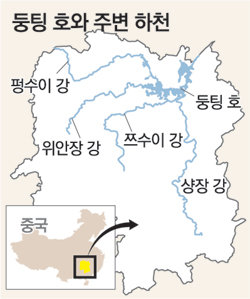 ▽급속히 작아지는 호수=2000년 전 둥팅 호는 자그마한 호수였다. 창장(長江) 강이 물줄기를 남쪽으로 틀면서 호수는 커지기 시작했다. 1640∼1825년엔 6000km²까지 커져 중국의 최대 호수였다.