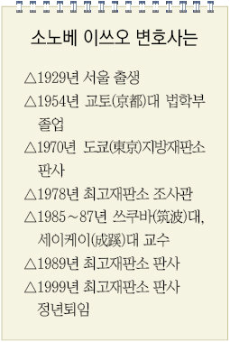 일본 최고재판소 판사(한국의 대법관에 해당)를 지낸 소노베 이쓰오(園部逸夫·77·사진) 변호사는 일본의 판사 검사 변호사는 한국 법조인에 비해 사회적 지위가 낮지만 사회에서 요구받는 윤리기준은 훨씬 엄격하다고 말했다.