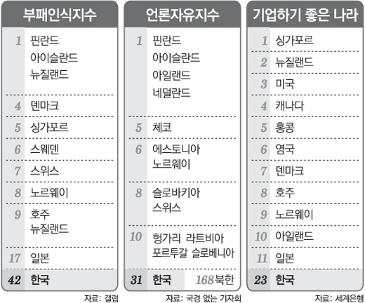 전자는 싱가포르, 후자는 한국이다. 세계은행 산하 국제금융공사(IFC)가 조사한 ‘기업하기 좋은 나라’ 평가의 결과다.