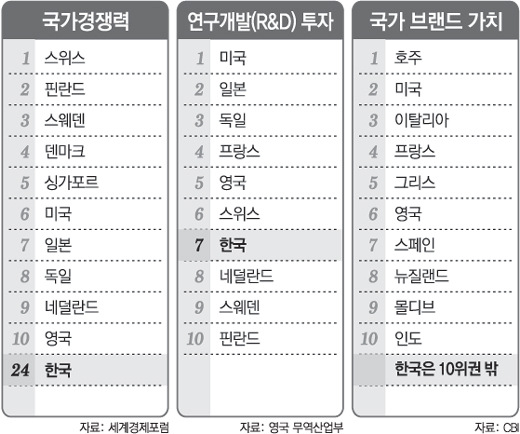 ▽국가 경쟁력 1위 스위스(한국 24위)=세계경제포럼(WEF)의 국가경쟁력 순위에서 스위스는 올해 처음 1위에 올랐다. WEF는 “스위스는 산업 인프라가 잘 갖춰져 있고 좋은 연구기관이 많으며 기술 혁신 능력이 뛰어나다”고 평가했다.