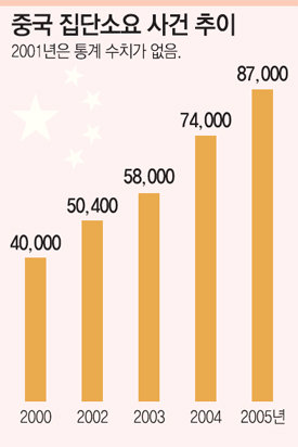 이 같은 집단소요 사건은 특히 최근 들어 급증하고 있다. 1993년 8700건에 불과하던 집단소요 사건이 지난해 8만7000건으로 10배 늘었다.