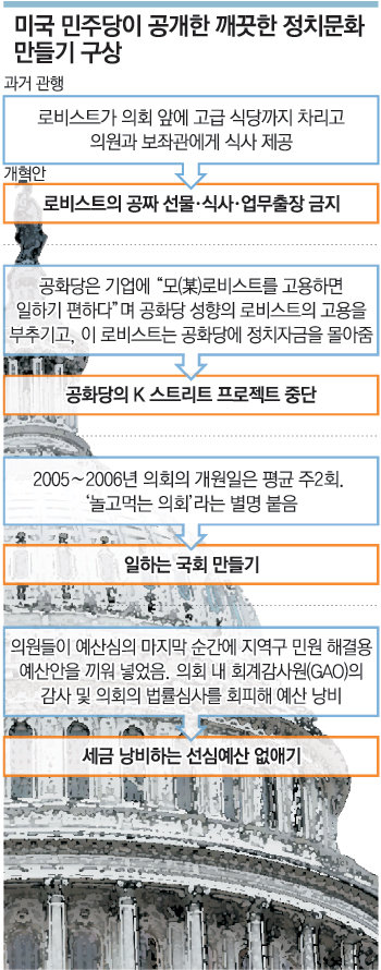 ▽깨끗한 정치=민주당이 작성한 부패청산 구상의 첫머리에는 공짜 선물, 공짜 식사, 공짜 여행을 금지한다는 조항이 담겨 있다. 공화당의 하원 원내대표 톰 들레이 의원이 스코틀랜드에 골프 여행을 떠났고, 의원보좌관들은 워싱턴 프로야구팀 경기를 로열박스에서 즐겨 봤다. 모두 로비스트의 접대로 확인되면서 ‘로비스트의 향응에 휘둘리는 정치인’ 문제가 여론의 뭇매를 맞았다.
