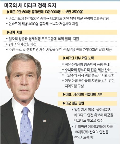 ▽치안확보 가능할까=현재 미군 1만5000명이 주둔하는 바그다드에 미군 1만7500명이 15일부터 3단계에 걸쳐 추가 투입된다. 이라크 정부도 5개 여단을 증파할 계획이어서 바그다드의 전력은 미군 3만2500명, 이라크군 2만 명, 이라크 경찰 3만 명으로 증강된다.