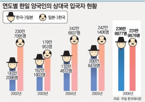 26일 일본 법무성과 주일 한국대사관에 따르면 지난해 일본에 입국한 한국인은 2005년보다 약 36만 명이 늘어난 236만8877명으로 집계됐다. 반면 한국을 찾은 일본인은 11만 명이 줄어든 231만9676명이었다.