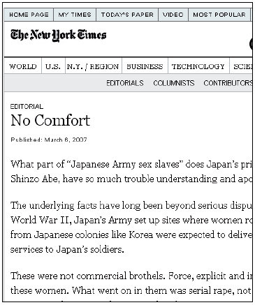 뉴욕타임스는 6일 사설에서 “일본 정치인들이 진실을 인정하는 것이 창피한 과거를 극복할 수 있는 첫 단계라는 것을 인식할 때가 됐다”고 충고했다.