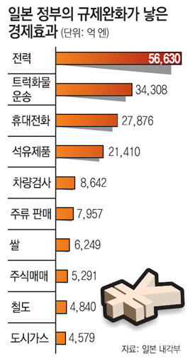 29일 니혼게이자이신문에 따르면 일본 내각부는 전력과 도시가스 등 14개 분야의 규제개혁으로 1991∼2005년에 생겨난 경제효과가 80조3000억 엔(약 642조4000억원)에 이른다고 공식발표했다.