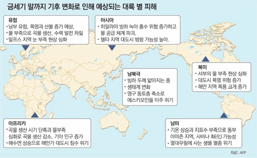 ∇아시아가 최대 피해 지역=IPCC는 인구 밀도가 높은 아시아 지역이 특히 심각한 피해를 볼 것으로 예상했다. 2050년까지 아시아 주민 10억 명이 물 부족 사태로 신음할 것으로 전망된다. 이는 히말라야의 빙하가 녹아내리기 때문으로 히말라야 빙하에서 내려오는 물에 의존하는 사람은 수억 명에 이른다.