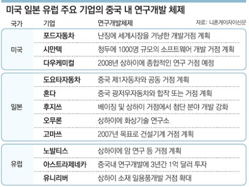 미국 일본 유럽의 대기업들이 세계 시장을 겨냥해 중요 연구개발(R&D) 기지를 중국에 두려는 움직임을 본격화하는 추세라고 10일 일본 니혼게이자이신문이 소개했다.