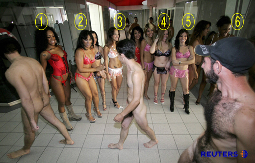 사진은 상파울루 '에로티카 박람회'장 입구 입니다. 비키니 차람의 여성들이 벌거벗고 들어오는 남성들의 엉덩이를 때리려고 합니다. 한명은 보다 자세히 보려는지 목을 길게 빼고 있습니다.