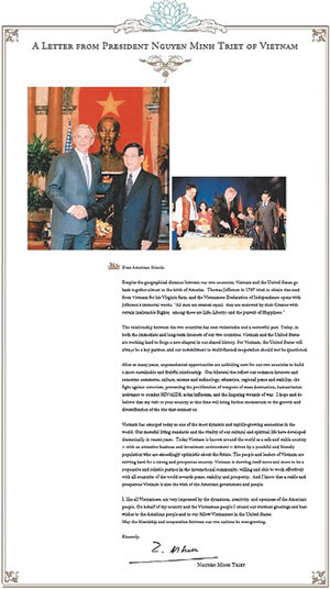 베트남전쟁 종전 32년 만에 처음으로 미국을 방문한 응우옌민찌엣 베트남 주석이 전면광고를 내서 미국인에게 편지를 보낸 것이다. 한 나라의 정상이 신문광고로 방문국 국민에게 편지를 보낸 것은 매우 이례적인 일.