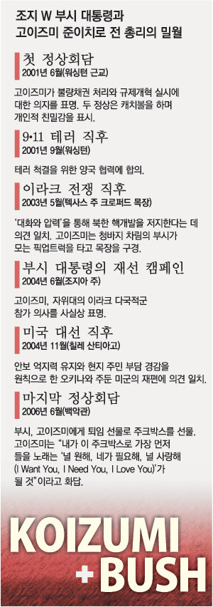 #2 2003년 고이즈미 준이치로 일본 총리는 조지 W 부시 대통령의 텍사스 주 크로퍼드 목장에서 청바지에 픽업트럭을 모는 부시 대통령의 안내를 받으며 목장을 돌았다. 수영장 파라솔 아래에서 통역만 대동한 채 2시간 넘도록 사적인 대화를 나눴다. 저녁 식탁에는 로라 부시 여사가 손수 구운 스테이크가 올랐다.》