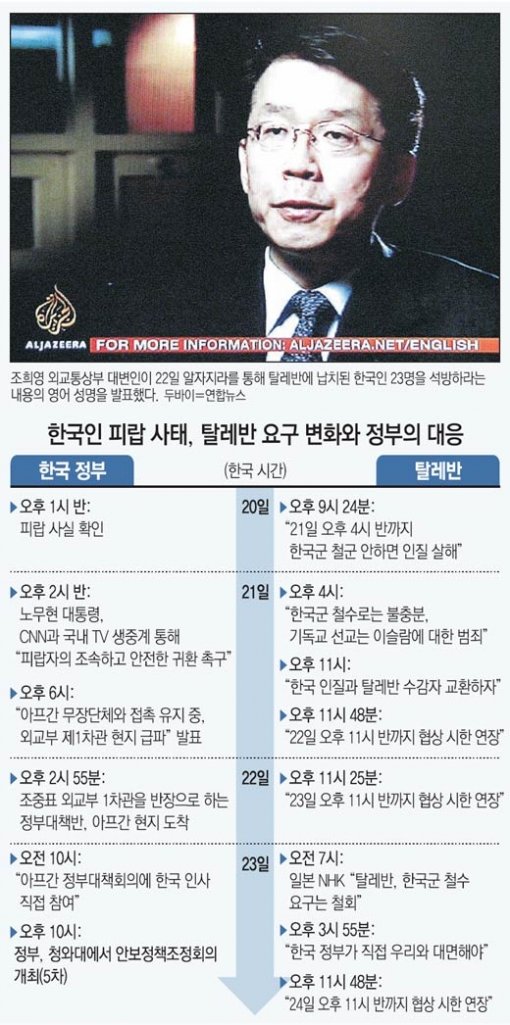 이런 가운데 몇 시간 뒤에는 아프간 정부 쪽에서 “한국인 23명과 탈레반 수감자 23명을 교환하자는 탈레반의 제안을 받아들이지 않겠다”는 강경 발언이 터져 나와 협상에 찬물을 끼얹었다.