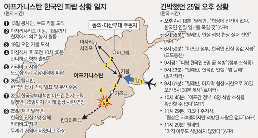 그러나 외신을 통해 “아프간 당국자가 한국인 인질 1명이 병사했다고 말했다” “아프간 정부가 탈레반의 한국인 인질 살해를 확인했다” “숨진 인질은 남성이다” 등 인질의 사망을 뒷받침하는 내용이 속속 날아들었다. 탈레반의 아마디 대변인은 AIP와의 통화에서 “아프간 정부가 탈레반을 속이려 했기 때문에 한국인 인질 가운데 1명을 오후 4시 15분(한국 시간 8시 45분)에 살해했다”고 주장했다.