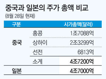 중국 기업의 주식시가총액이 일본을 추월했다. 중국 언론은 홍콩 증시에 상장된 중국 기업과 상하이(上海), 선전(深(수,천))의 주가총액이 28일 현재 4조7200억 달러로 일본 증시 주가총액 4조7000억 달러를 넘어섰다고 30일 보도했다.