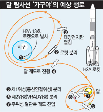 무게 50kg의 작은 위성 2개를 포함해 총 3t에 이르는 ‘가구야’는 발사된 뒤 지구를 두 바퀴 돈 다음 약 37일 뒤에 달의 고도 약 100km를 도는 관측궤도에 진입한다.