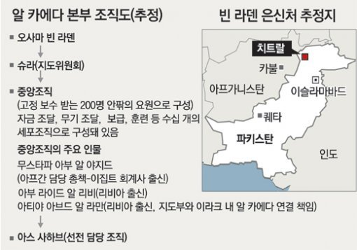 미 CBS방송은 7일 정보당국 소식통들을 인용해 파키스탄 북부의 치트랄 산악지역을 빈 라덴이 은신하고 있는 근거지로 지목했다. 이곳은 험준한 산악지역인 데다 현지 부족들에 의해 지배돼 파키스탄 군대의 영향력도 미치지 않는 곳이다. 본부에서 주요 결정을 내려 빈 라덴에게 보고하는 기구는 ‘슈라’라고 불리는 지도위원회다. 슈라 밑에는 자금, 병참 등 여러 세포조직이 있다. 본부에 근무하는 200여 명 가운데 상당수는 정기적으로 급료를 받는다.