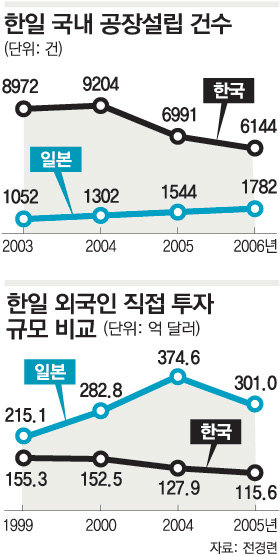 반면 한국은 2003년 8972건, 2004년 9204건에 이르던 국내 공장 신규 설립 건수가 2005년 6991건으로 줄어든 데 이어 지난해에는 6144건으로 더 떨어졌다.