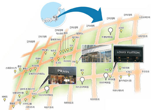 일본에서 가장 비싼 상업지로 꼽히는 긴자에서 프랑스 이탈리아 미국 등의 명품 브랜드들이 세계적으로 유례가 드문 대형화·고급화 경쟁을 벌이고 있다.》