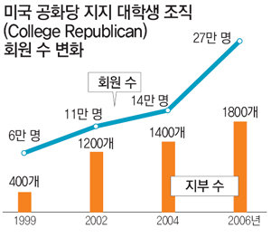 특히 부시 행정부 2기들어 민주당은 젊은층에서 지지세를 더욱 넓혔다. 최근 여론조사들을 보면 18~29세 유권자의 정당 지지율은 민주당 62%, 공화당 30%로 민주당이 압도적 우위다. 이는 전체 유권자에서 민주당이 12% 포인트 앞서는 것 보다 훨씬 큰 격차를 보이는 것. 지난해 11월 중간선거때 젊은층에서 민주당 우세가 20% 포인트였던데 비해서도 민주당 지지세가 더 확산된 것.