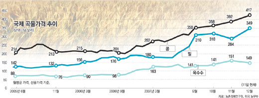 바이오연료용 곡물 수요와 세계 원자재 시장의 블랙홀인 중국과 인도 등의 곡물 수요도 급증하고 있어 곡물 가격 급등세는 계속될 것으로 보인다. 내년도 세계 곡물 소비량은 사상 최대인 20억9500t이 될 것으로 전망된다.