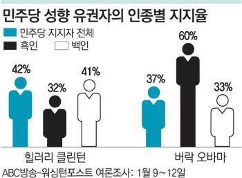 ▽유권자의 묘한 흑백의식=19일 네바다 프라이머리(예비경선)에서 흑인 유권자 중 83%가 오바마 후보를 지지했다. 불과 3개월 전만 해도 흑인 표의 절반 이상은 경쟁자인 힐러리 후보에게 몰렸던 것과 비교하면 급격한 변화가 아닐 수 없다.