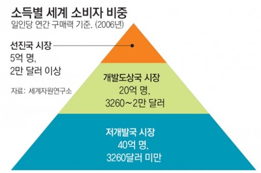 세계자원연구소도 최근 보고서에서 ‘피라미드의 밑바닥(BOP)’을 이루는 40억 명에 주목할 것을 제안했다. 이들은 연간 구매력이 3260달러 이하로 모두 합쳐 5조 달러의 시장을 형성하고 있다.