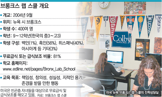 학생들이 그룹을 지어 프로젝트를 수행하는 토론식 수업, 쉬는 시간에도 교실에서 책을 읽는 학생들, 일부 학생은 컴퓨터 앞에 앉아 뭔가 열심히 문서작업을 하고 있었다. 정돈되고 차분한 학교 풍경은 바깥 브롱크스 지역과는 전혀 다른 세상처럼 보였다. 뉴욕의 교육개혁 현장을 취재하기 위해 뉴욕 시 교육국에 ‘모범적인 공립학교를 소개해 달라’고 요청했을 때 교육국 관계자는 “반드시 브롱크스 랩 스쿨을 봐야 한다”고 강력히 추천했다.》
