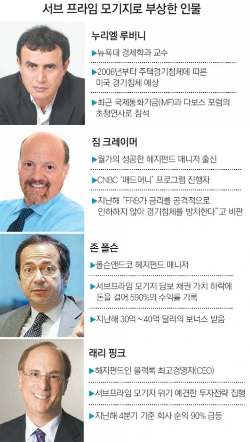 미국의 서브프라임 모기지(비우량주택담보대출) 사태로 전 세계 금융시장이 홍역을 앓고 있지만, 오히려 이 때문에 갑자기 부상하거나 큰돈을 번 사람들도 있다.