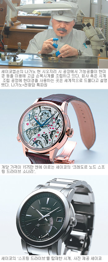 《일본 나가노(長野) 현의 중심부에 위치한 시오지리(鹽尻) 시의 세이코엡손 공장. 세이코 손목시계 가운데서도 ‘그랜드 세이코’ 등 고급 브랜드만을 생산하는 이 공장의 ‘직인(職人)공방’ 풍경은 여느 시계공장과 전혀 달랐다. 방문객이 큼지막한 유리창을 통해 안을 들여다볼 수 있지만 공방 안과 밖은 철저하게 차단돼 있었다. 기능공들도 에어샤워 룸(압축공기로 먼지를 떨어내는 공간)을 통과한 뒤에야 안으로 들어갈 수 있다.》