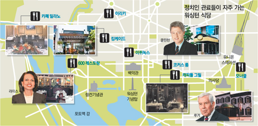 대통령 부인 로라 부시 여사는 각국 대사관이 밀집해 있는 듀퐁서클 근처의 이탈리안 레스토랑 ‘이리키’를 좋아한다. 시아버지인 조지 부시 전 대통령은 중국 베이징(北京) 근무 당시 맛본 ‘페킹 덕(베이징 오리구이)’에 매료돼 지금도 ‘페킹 고메이’ 레스토랑을 자주 찾는다.