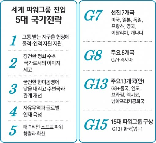 이들은 “한국이 산술적으로 경제, 군사 분야에서 세계 10위권 안팎의 발전을 이뤘지만 종합적인 국력이나 국제질서 형성에 미치는 영향력은 그에 미치지 못 한다”며 “세계 15대 파워그룹(G15) 진입을 당면 목표로 삼아 국가 차원의 구체적 액션플랜을 세워 시급히 시행해야 한다”고 주문했다.
