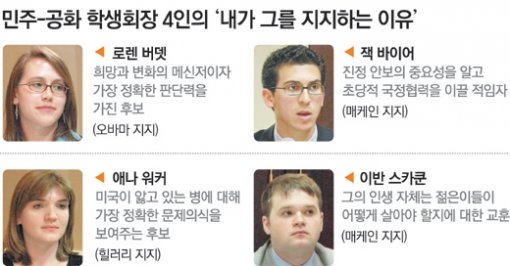 반면 공화당원학생회(College Republicans)를 이끌고 있는 잭 바이어 펜실베이니아대 회장과 이반 스카쿤 드렉슬대 회장은 존 매케인 상원의원을 지지하는 이유를 밝혔다.