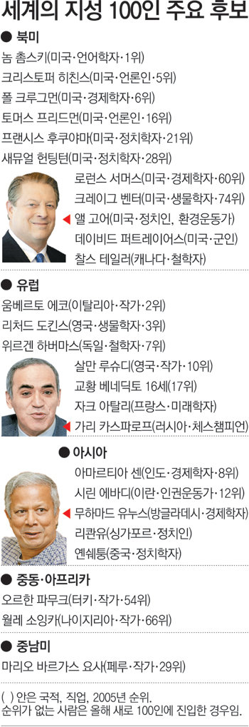 대신 환경운동가로 변신해 노벨 평화상까지 거머쥔 앨 고어 전 미국 부통령, 러시아의 체스 영웅에서 야권 지도자로 활동무대를 옮긴 가리 카스파로프, 방글라데시의 무하마드 유누스 그라민 은행 총재 등이 후보 명단에 처음으로 이름을 올렸다.