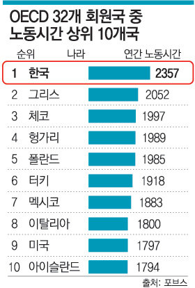 한국 근로자들의 노동시간이 경제협력개발기구(OECD) 32개 회원국 가운데 가장 긴 원인은 근면해서라기보다는 상사의 눈치를 살피는 문화 때문이라고 미국 격주간 경제전문지 ‘포브스’ 최신호가 보도했다.