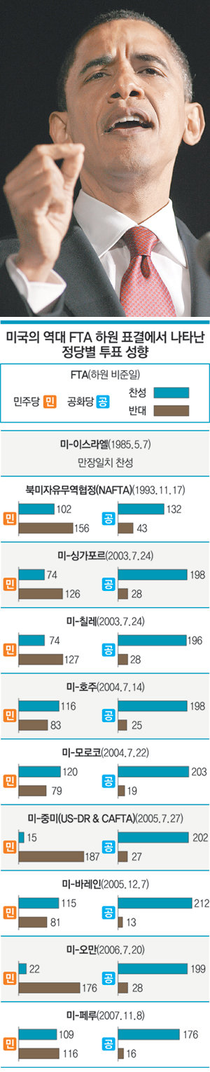 Q. 민주당은 왜 FTA를 그토록 반대하나=전문가들은 민주당의 전통적 지지기반, 현 단계 미국 경제의 불확실성, 대선 전략 등 세 가지 요인이 결합된 것으로 분석했다.