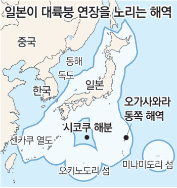 일본 정부는 2004년부터 태평양의 오가사와라(小笠原) 제도 등 65만 km²의 해역을 대상으로 조사선을 파견해 해저의 지질과 지하 구조를 정밀 조사해 왔으며 이중 시코쿠(四國) 남단의 ‘시코쿠 해저분지’와 오가사와라 제도의 동쪽 영역 등 38만 km²의 면적을 대륙붕으로 신청하기로 했다.
