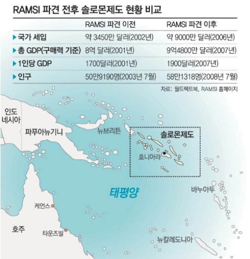 《내전을 겪고 있던 인구 58만 명의 작은 섬 솔로몬제도에 호주를 비롯한 15개국이 솔로몬제도지역원조단(RAMSI)을 파견해 ‘국가 재건’에 나선 지 5년이 지났다. 제2차 세계대전 이후 국제사회는 22차례에 걸쳐 전쟁이나 내전으로 위기를 맞은 국가의 재건에 참여했지만 RAMSI는 미국이나 유럽 강대국과 유엔이 참여하지 않은 유일한 국가재건 사례다. 》