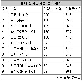 예컨대 74개 로스쿨 중 도쿄(東京)대 주오(中央)대 게이오(慶應)대 와세다(早稻田)대 교토(京都)대 등 5곳은 올해 100명이 넘는 합격자를 배출한 반면, 아이치가쿠인(愛知學院)대 신슈(信州)대 히메지돗쿄(姬路獨協)대 등 3곳은 합격자를 단 한 명도 내지 못했다.
