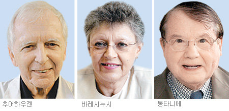 스웨덴 카롤린스카 의대 노벨상선정위원회는 6일 올해 노벨 생리의학상 수상자로 독일의 하랄트 추어하우젠(72) 박사, 프랑스의 프랑수아즈 바레시누시(61·여), 뤼크 몽타니에(76) 박사 등 3명을 공동 선정했다고 밝혔다.