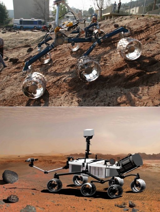 미국 캘리포니아 패서디나의 제트 추진 연구소(Jet Propulsion Laboratory, 미항공우주국 산하 기구) 직원들이 화성탐사 로봇‘스캐어크로우(Scarecrow)’를 실험하고 있다.(사진 위) 미국 항공우주국(NASA)는 11일 내년으로 예정된 화성 탐사선 MSL 발사 계획을 계속 추진할 것이라고 밝혔다. 나사는 기술적으로 어려움이 있지만 사업을 예정대로 추진키로 했다고 덧붙였다. 핵에너지로 작동하는 SUV 크기의 스캐어크로우 로봇은 화성 표면을 돌아다니며 미생물 서식 가능성을 조사하게 된다. 사진=NASA <동아닷컴>
