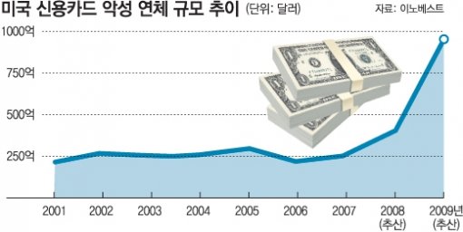 현재 미국 내 신용카드 사용 대금 미결제금액은 9500억 달러(약 1220조 원). 투자 자문업체인 이노베스트는 이 중 410억 달러는 사실상 상환을 기대하기 어려운 ‘악성 연체’로 분류하면서 내년에는 악성 연체 규모가 960억 달러로 증가할 것으로 전망했다.