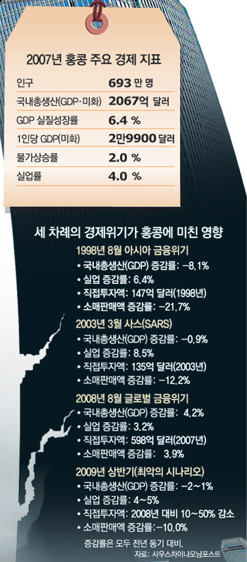 《홍콩의 빅토리아 피크 중턱 ‘미드 레벨’ 지역은 최고급 주택가로 꼽힌다. 100여 m² 아파트의 한 달 월세가 최고 1000만 원에 이르는 곳도 있어 외국계 금융기관 고소득자가 주로 산다. 15일 미드 레벨을 가로지르는 로빈슨 로드. 길 오른편으로 줄지어 있는 부동산 중개업소마다 ×표시(할인한다는 뜻)를 한 안내문이 가득했다. ‘놀라운 가격’ ‘위기에서 기회를 잡으세요’ 등의 설명도 보였다. 이곳의 매매가 및 임대료가 내려가기는 2003년 중증급성호흡기증후군(SARS·사스) 사태 이후 처음이라고 한다. 하용이 한국은행 홍콩사무소장은 “아시아 금융 허브를 자처하는 홍콩에 불어 닥친 글로벌 금융위기의 여파를 단적으로 보여 준다”고 말했다. 매연으로 뿌옇게 덮인 홍콩 하늘만큼이나 미래에 대한 불안이 커지고 있다.》