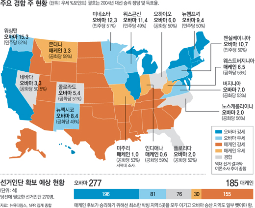 270명의 선거인을 확보하면 승리하는 이번 대선에서 오바마 후보는 이미 확실우세 196석, 승산 81석 등으로 270명을 넘나들고 있다.