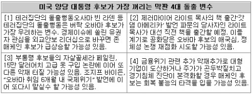 하지만 감세 정책을 둘러싼 논쟁 등 막판 쟁점이 여전히 남아 있고, 오사마 빈 라덴 체포나 대형 테러사건 같은 돌발 변수가 터질 경우 대선 판도에 격동이 일어날 수 있어 아직 오바마 캠프가 안심하기는 이르다.