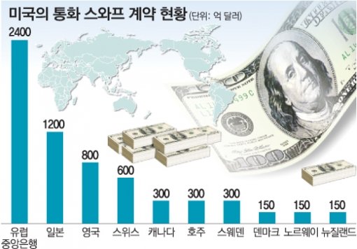 미국은 리먼브러더스 사태 직후인 지난달 18일 유럽중앙은행과 영국은행, 일본은행 등 세계 5개 주요국 중앙은행과 통화스와프 한도액을 기존의 670억 달러에서 1800억 달러가량 늘어난 2470억 달러로 확대했다.